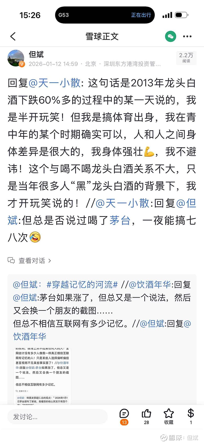 //@天一小散:回复@但斌:但总是否说过喝了茅台,一夜能搞七八次//@但斌:回复@天一小散: 这句话是2013年龙头白酒下跌60%多的过程中的某一天说的,我是半开玩笑!但我是搞体育出身,我在青中年的某个时期确实可以,人和人之间身体差异是很大的,我身体强壮💪,我不避讳!这个与喝不喝龙头白酒关系不大,只是当年很多人“黑”龙头白酒的背景下,我才开玩笑说的!