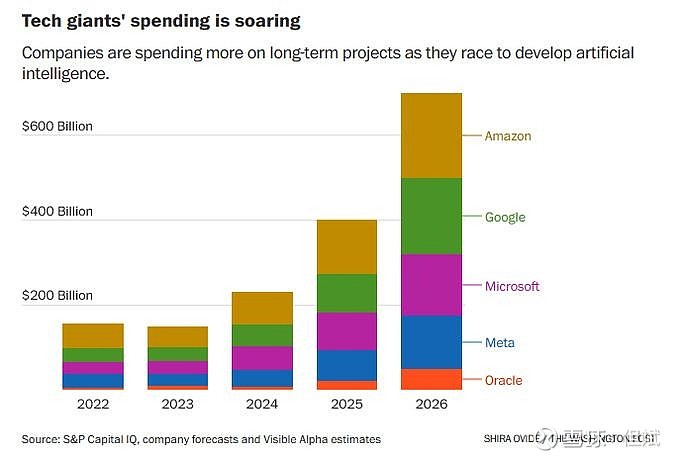 转:预计今年,五家公司(亚马逊、谷歌、Microsoft、Meta、甲骨文)将在人工智能基础设施上投入7000亿美元,几乎是2025年的两倍,相当于美国军费预算的四分之三。