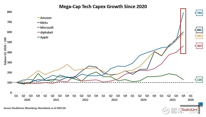 自 2022 年 11 月 ChatGPT 推出以来, $MSFT和$GOOGL的资本支出增加了四倍, $AMZN和$META的资本支出增加了三倍。