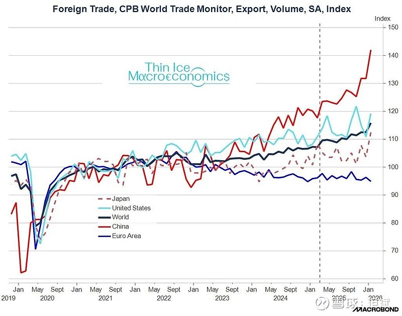 转:前欧洲央行经济学家Spyros Andreopoulos发文称,中国出口在特朗普关税之后表现“惊人”。图表显示,中国出口量指数自2025年以来明显上升,涨幅领先全球、美国、日本和欧元区。
