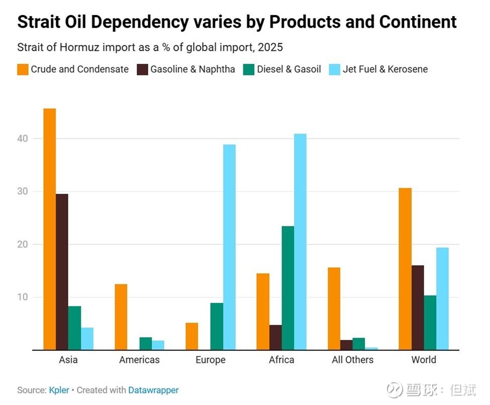 相比之下,欧洲最大的脆弱性在于航空燃油和煤油,约 39% 的进口依赖于霍尔木兹港。