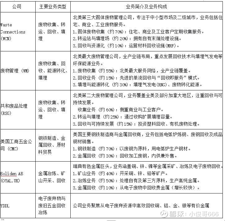 在全球资源循环与可持续发展的浪潮中,废弃物管理与资源化行业正迎来结构性机遇。本文通过对六家国际上市企业的对比分析,梳理出两条清晰的发展路径:一类是以Waste Connections(WCN)、美国废物管理(WM)及共和废品处理(RSG)为代表的综合固废管理巨头,业务横跨收集、转运、填埋与回收,形成全产业链布局;另一类则是以美国工商五金公司(CMC)、瑞典Boliden AB及菲律宾上市公司YDDL为代表的专业金属资源化企业,它们深入金属回收与冶炼这一高价值细分赛道,将废弃物转化为关键工业原料。