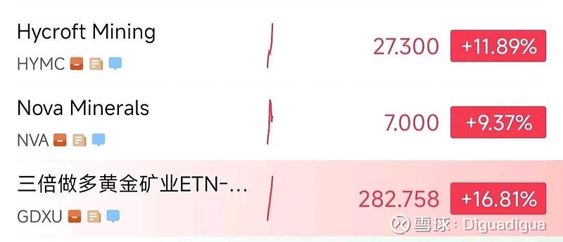 美股买的三个股票今天太炸裂了炒股10多年,创记录的一天美股太疯狂了 $Hycroft Mining(HYMC)$ 半年多一点涨了10倍,两周前单日涨了49.33%后,今天截止目前又涨12%。这种涨法谁能拿得住啊?@凝视三千弱水的深渊 博士是不是一直拿着啊?$Nova Minerals(NVA)$$金矿指数3倍做多ETN(GDXU)$