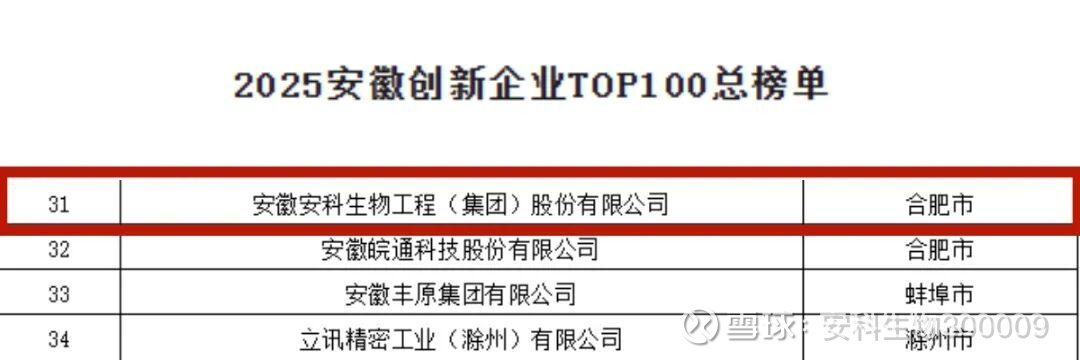 2026年1月31日,《2025安徽创新企业TOP100发展报告》及《2025安徽新质生产力企业TOP100发展报告》蓝皮书在合肥正式发布。安徽安科生物工程(集团)股份有限公司凭借持续的创新投入和稳健的经营表现,荣登“2025安徽创新企业TOP100总榜单”以及“安徽创新企业最具投资价值TOP10榜单”。