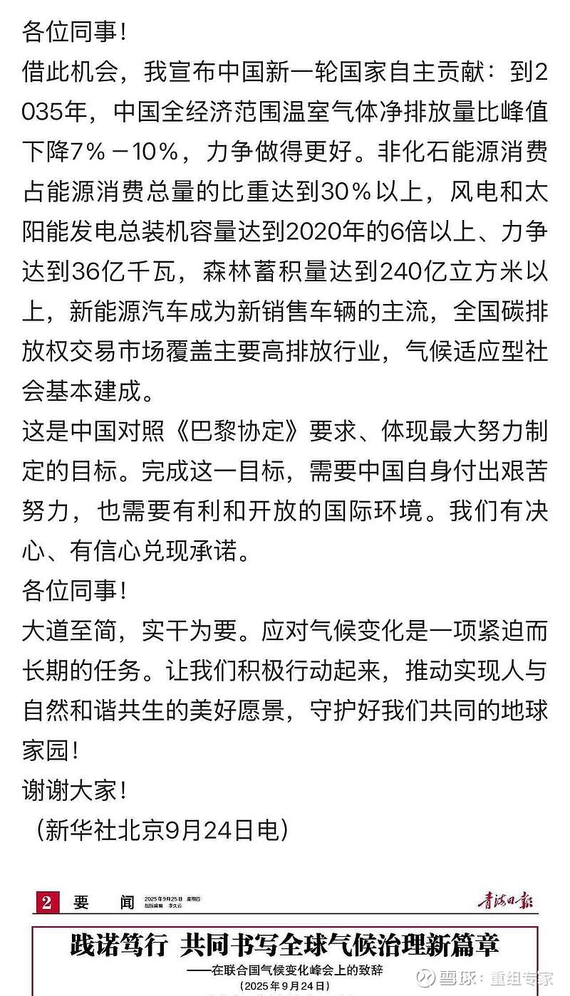 $大唐新能源(01798)$ $龙源电力(00916)$ :学习“践诺笃行 共同书写全球气候治理新篇章 ——在联合国气候变化峰会上的致辞 (2025年9月24日)”体会。