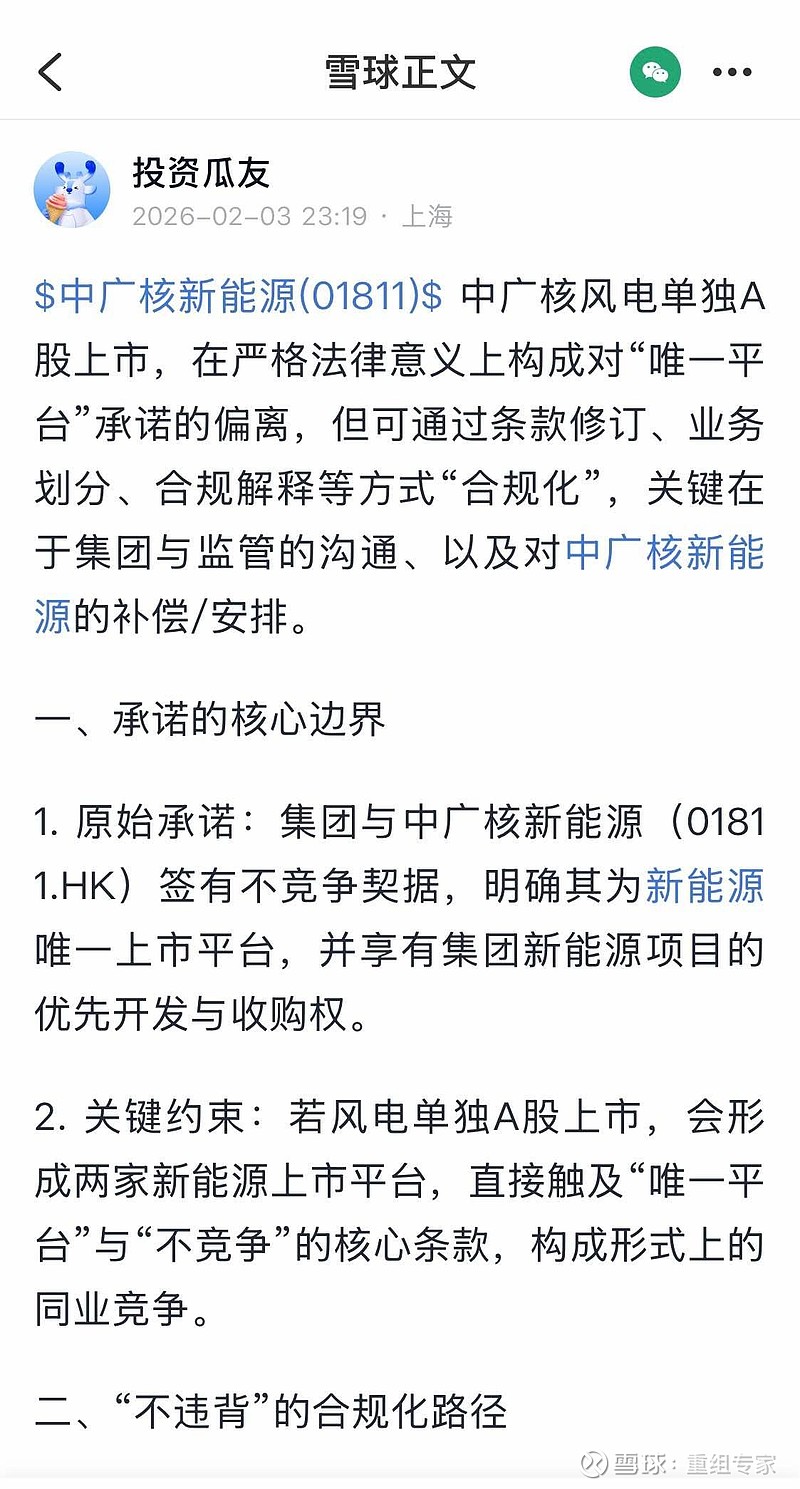$中广核新能源(01811)$ :记得“投资瓜友”投资广核新亦有五年光景,随着前海开源基金的退出,瓜友现在应该是广核新最大的公众股东(据说是一亿多股),今年公司不少关联交易议案授权到期,到时瓜友的投票举足轻重,因此,对瓜友的建议和意见,公司还是要有足够的重视。