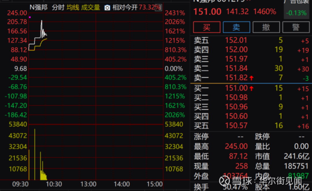 N强邦新材股价盘中最高触及245.00元,盘中最高涨2400%,该股发行价仅为9.68元。另一只新股N铜冠盘中最高涨近1200%。