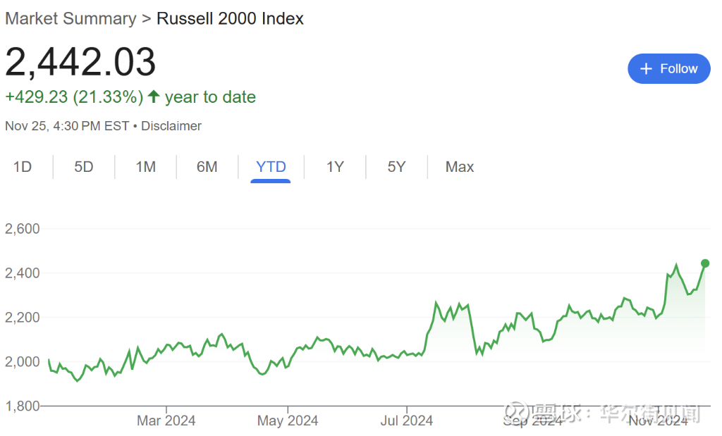 昨日,衡量美国小盘股的罗素2000指数收涨1.47%报2442.03,盘中一度上涨2.5%,接近其2021年11月创下的盘中历史高点2442.74。
