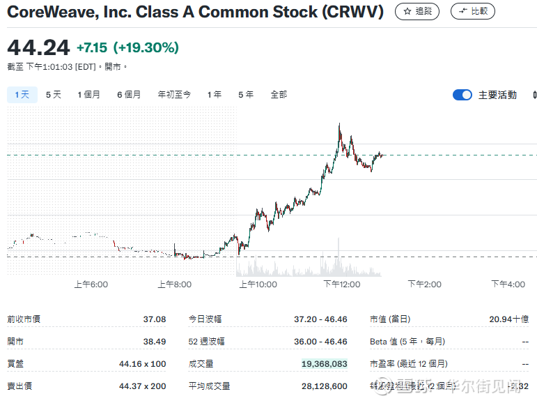 进入本周一,CoreWeave再度下跌逾10%,一度跌破发行价,投资者信心进一步受挫。但在周二,该股强势反弹,盘中涨幅一度超过25%,股价一度升至46.46美元,市值随之突破200亿美元。