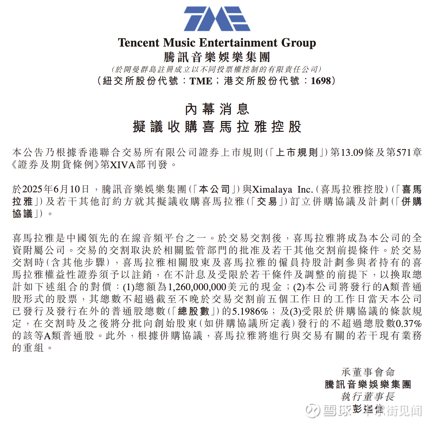 周二,腾讯音乐宣布,以12.6亿美元现金收购喜马拉雅控股。除了现金支付,还将授予喜马拉雅相关股东不超过腾讯音乐已发行及在外流通普通股总数5.1986%的A类普通股,并将向其创始股东发行不超过总股数0.37%的A类普通股作为激励。