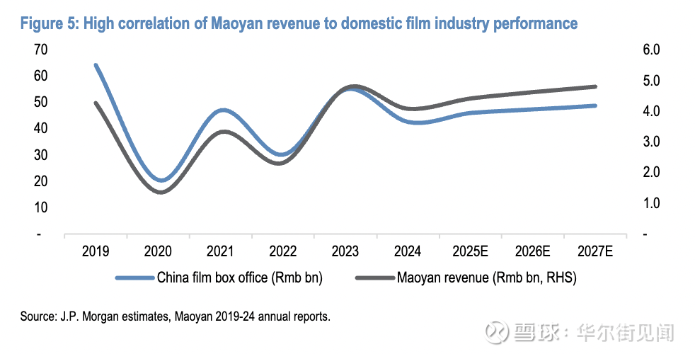 报告预测,国内电影票房2025年将仅增长8%,2026和2027年恢复至3%的正常增速,受此限制,猫眼2025和2026年收入预计仅增长8%和4%,分别为44亿元和46亿元人民币,低于市场共识9%和13%。