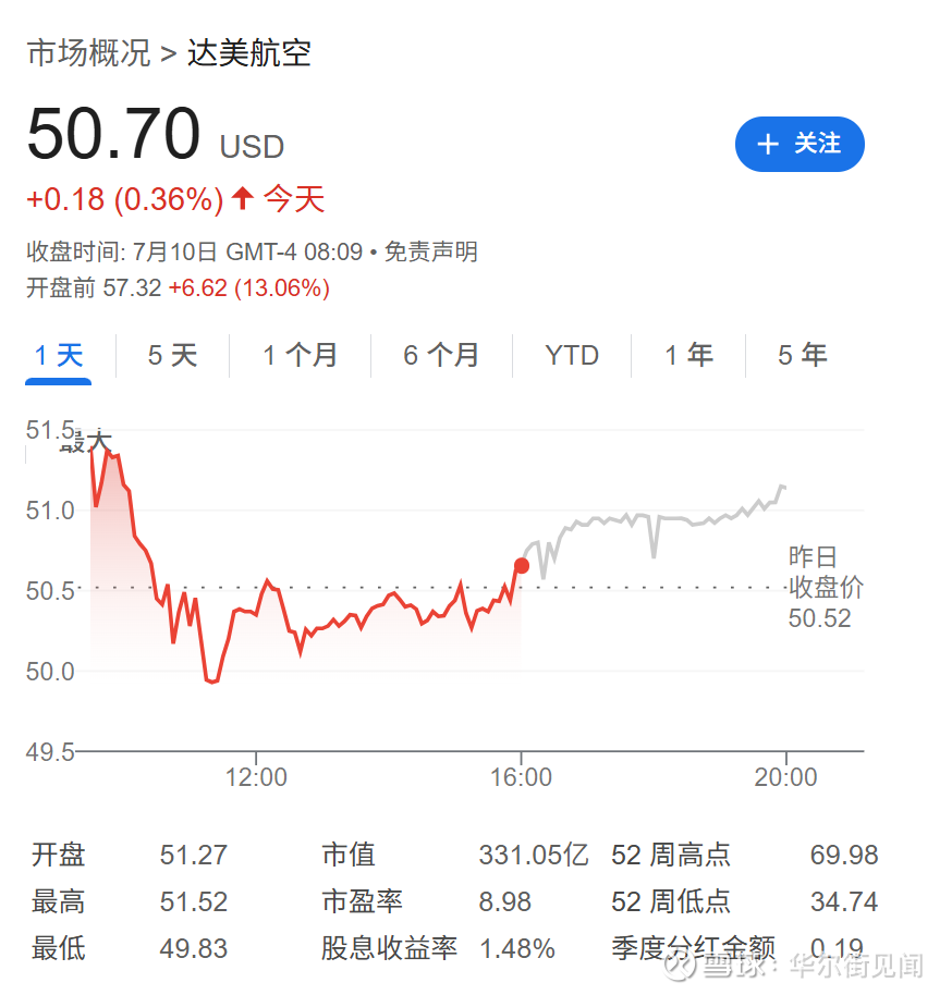 达美航空同时还公布了第二季度业绩。调整后每股收益2.10美元,超过分析师平均预期的2.07美元。季度收入与去年同期持平。