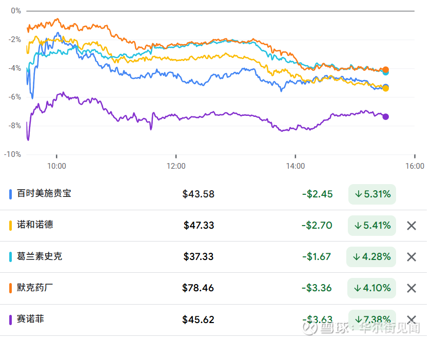 这一消息立即引发了制药板块的抛售。葛兰素史克和默克的股价跌幅超过4%,百时美施贵宝和诺和诺德的股价下跌逾5%,赛诺菲的股价更是大跌超过7%。