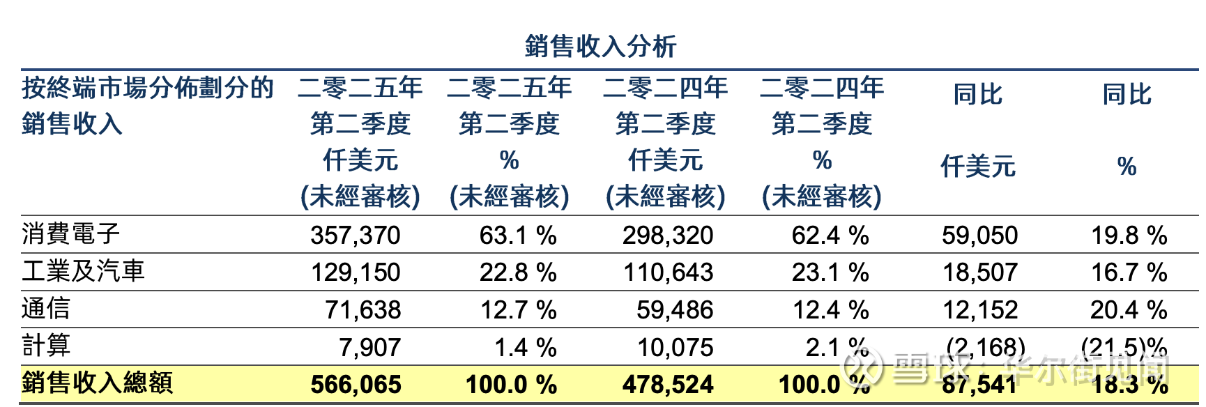 下游应用分化明显从下游应用看,消费电子仍是绝对主力,占收入83%,同比增长21.8%。但这一增长更多体现的是存量博弈而非增量扩张,毕竟当前全球消费电子市场整体仍处调整期。
