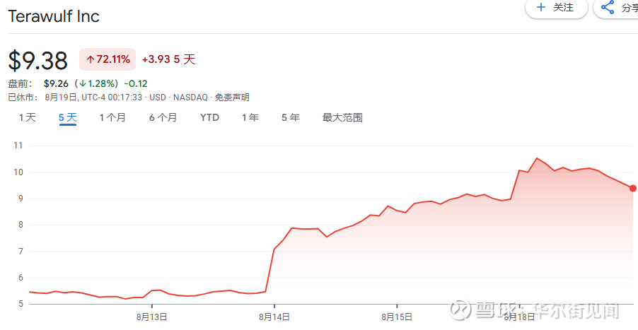 谷歌增持,带飞TeraWulf受谷歌增持消息的提振,TeraWulf股票在过去5个交易日内一度飙升近90%。
