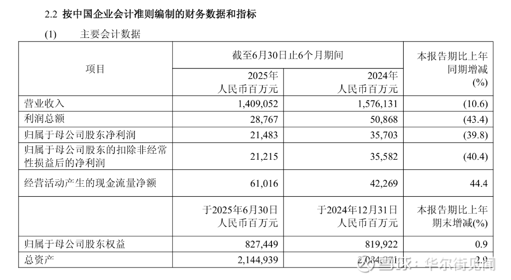油气当量产量2.63亿桶,同比增长2.0%,创历史同期新高 原油加工量1.20亿吨,同比下降5.3% 成品油总经销量1.12亿吨,同比下降5.8% 乙烯产量756.3万吨,同比增长16.4% 量价齐跌拖累业绩,但降幅可控中国石化2025中期营收端承压明显。1.41万亿元的营收同比下降10.6%,主要受国际油价下跌和成品油需求疲软双重冲击。布伦特原油均价71.7美元/桶,同比下降14.7%,而境内成品油消费量同比下降3.6%,汽油和柴油分别下降4.6%和4.3%。