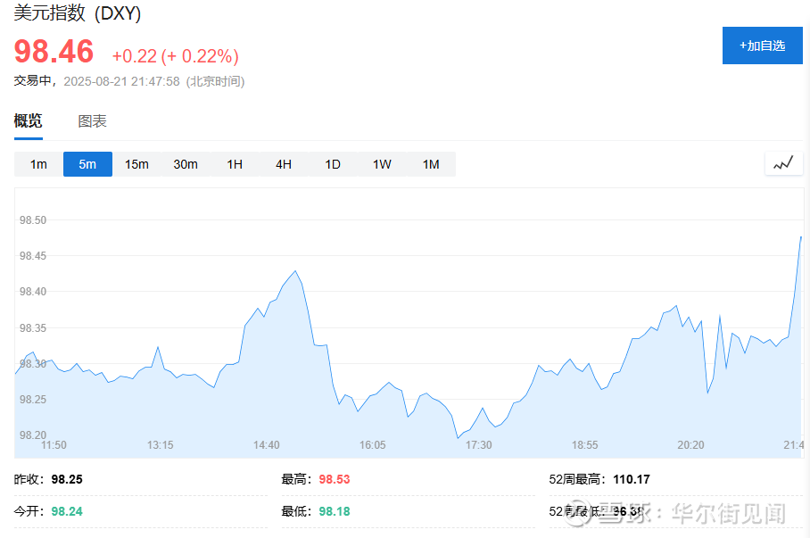 美国PMI数据公布后,美元指数短线走高,日内涨0.22%。