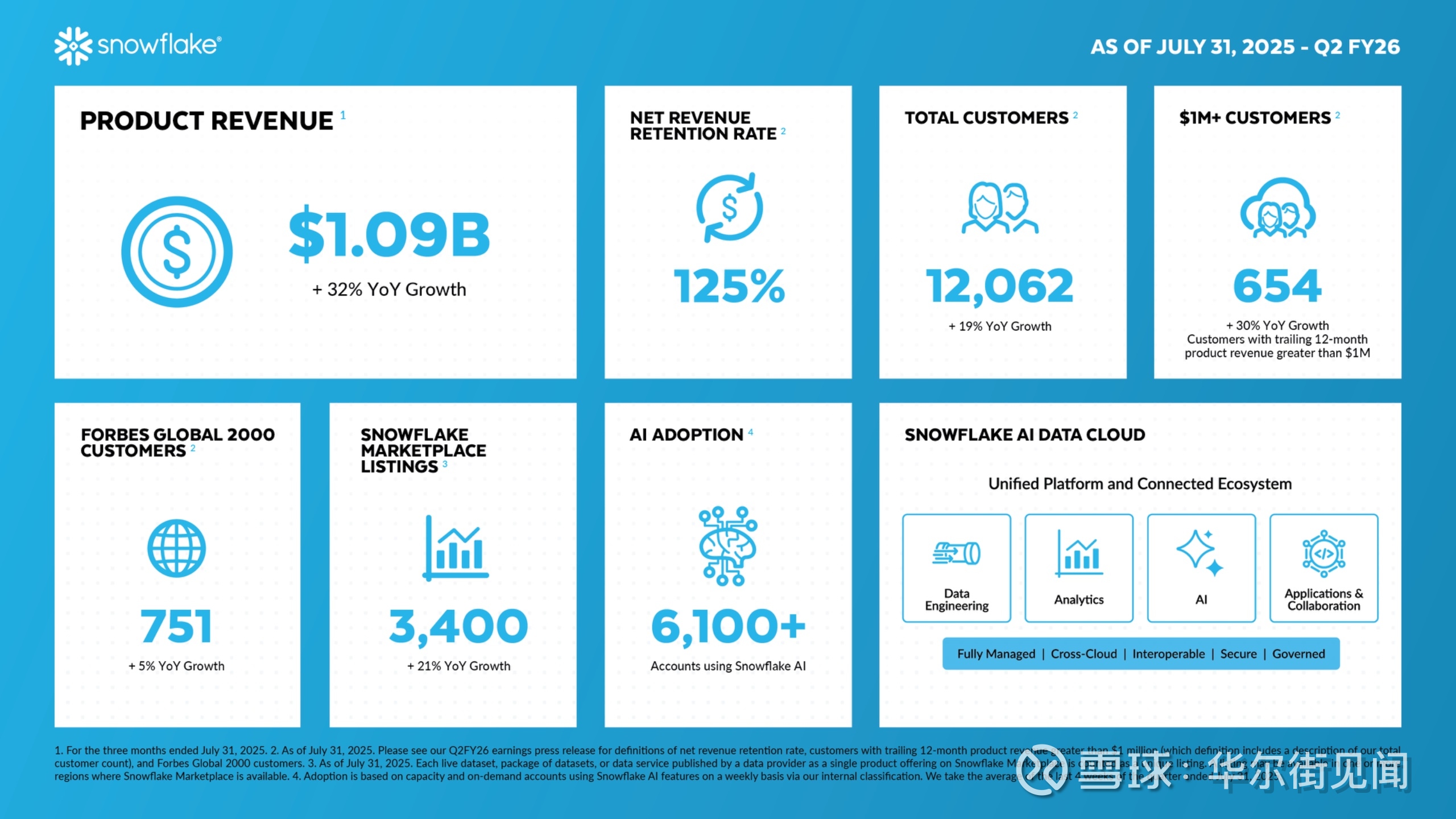 AI数据云平台公司Snowflake周三公布2026财年第二季度(截至2025年7月31日)财务业绩,该公司上调了2026财年的产品收入预期,主要因企业在人工智能支出上持续加码,推动其数据分析服务需求强劲增长,缓解了市场对经济放缓以及新兴AI公司抢占市场份额可能冲击传统软件厂商的担忧。消息发布后,该公司股价在盘后交易中一度上涨13%。