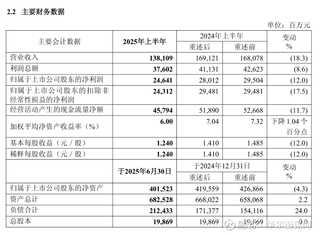 营业收入1381.09亿元,同比下降18.3%。 净利润246.41亿元,同比下降12.0%。 经营活动产生的现金流量净额为457.94亿元,同比减少11.7%。 基本每股收益从去年同期的1.410元降至1.240元。核心业务进展:
