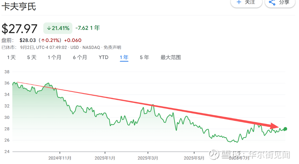 此次拆分旨在简化业务结构,提升品牌资源配置和盈利能力,回应持续的业绩压力和行业变革。卡夫亨氏股价在消息公布后波动有限,但过去一年已累计下跌21%,反映出市场对其增长前景的担忧。