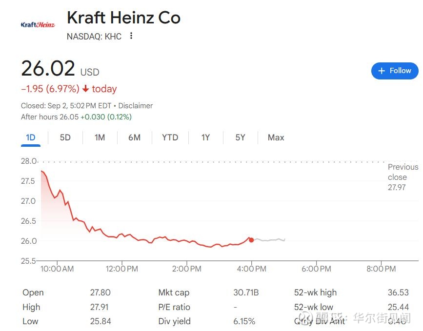 美东时间9月2日周二,卡夫亨氏股价低开低走,美股盘中跌超7%,午盘刷新日低时跌7.6%,收跌将近7%,抹平两个月来所有涨幅,刷新6月30日以来收盘低位。截至周二收盘,卡夫亨氏股价今年初以来累跌15.3%,远逊大盘,标普500指数同期累涨逾9%。