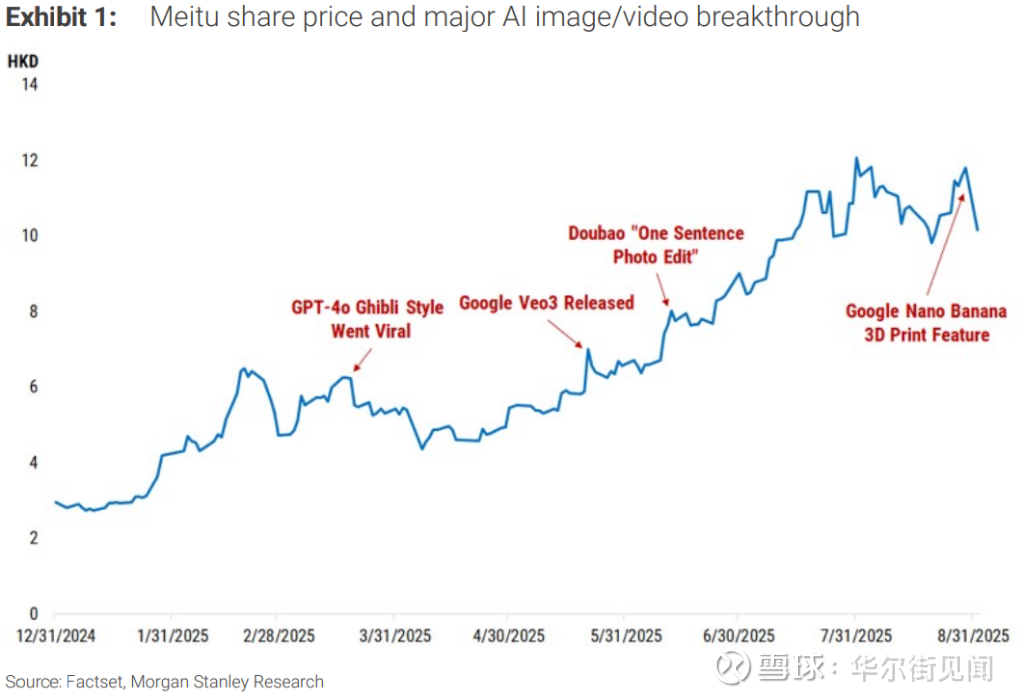 今年以来,每当有类似GPT-4o或谷歌Veo3等重量级AI模型发布更新时,美图的股价都曾出现过类似的波动。