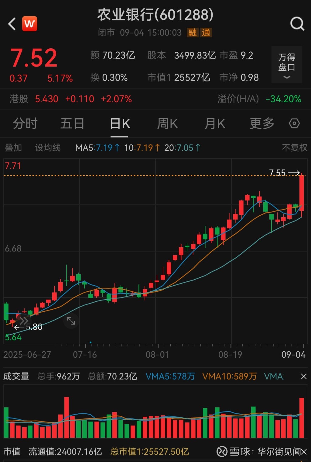 8月6日,农业银行A股市值首次超越工商银行,登上A股市值冠军宝座。不到一个月,A+H股总市值也实现反超,显示资金对农行的持续青睐。