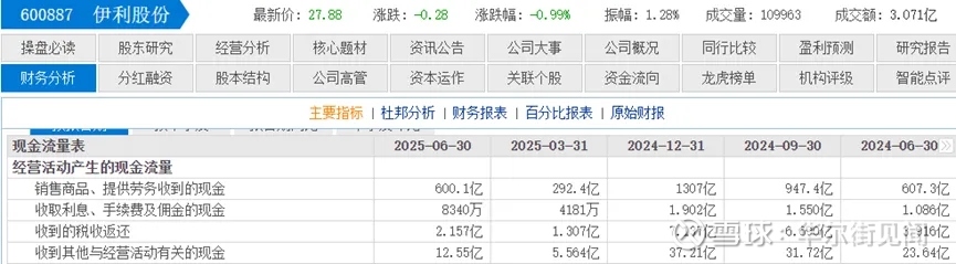 伊利股份上半年回笼现金超过600亿元,平时一个季度就是几百亿,旺季甚至能冲到千亿以上,乳制品生意俨然成了源源不断的“现金收割机”。