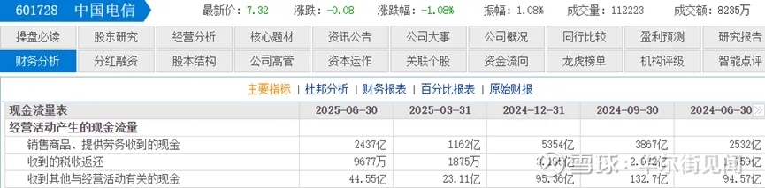 中国电信亦是“账单式”的稳定机器,上半年经营现金流就达到2400多亿元,单季度常常是千亿规模滚入,稳定程度堪高。