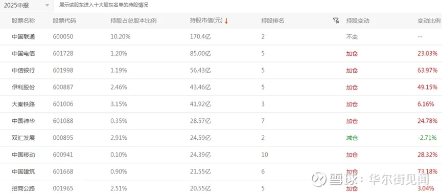 (如上图)最大的持仓是中国联通,市值超过170亿元;接下来是中国电信、伊利股份、中信银行、大秦铁路、中国神华、双汇发展、中国移动、中国建筑、招商公路等,市值都在数十亿元以上。