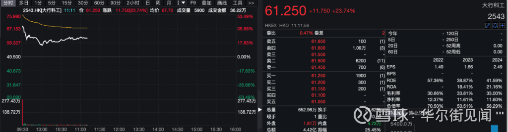 截至发稿,大行科工涨幅缩窄至23%,报61.25港元/股。