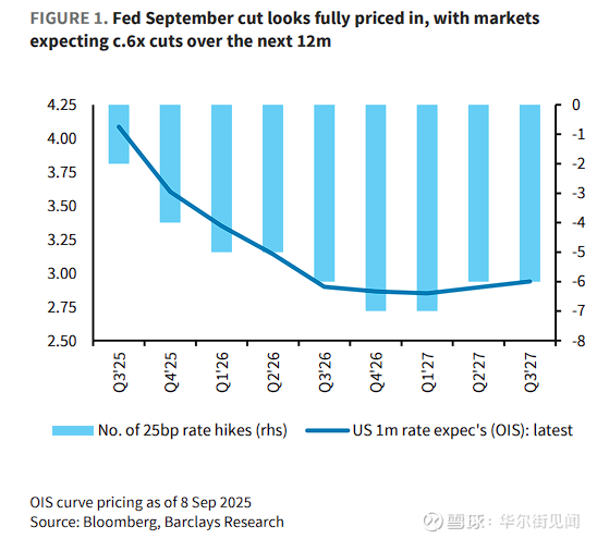 研报称,市场普遍预期美联储下周将重启降息周期,且市场定价显示未来12个月约6次降息。在无衰退情形下,股市在降息后稳步上涨并在6个月内创新高,表现优于债券。但若衰退发生,股市通常在降息后继续下跌,不过12个月后会反弹。