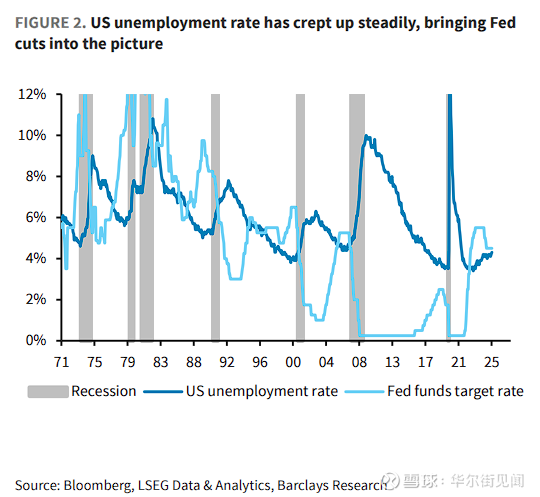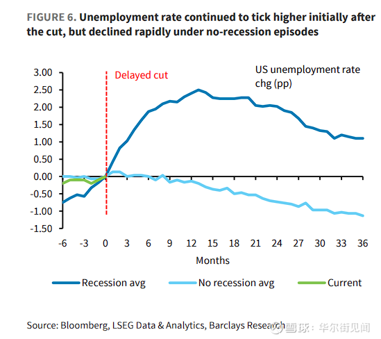 巴克莱强调,失业率成为区分两种情形(经济衰退或经济扩张)的关键指标。历史数据表明,当衰退发生时,失业率在降息后持续上升近一年;而经济持续扩张时,失业率仅小幅上升后在几个季度内开始下降。目前美国失业率已稳步攀升,这正是促使美联储考虑降息的关键因素。