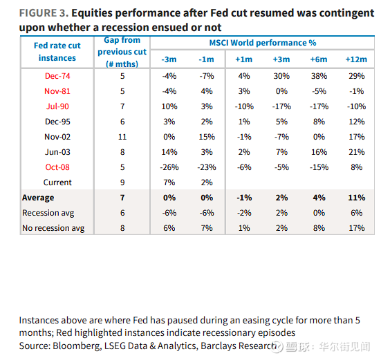 9月11日,据追风交易台消息,巴克莱在最新研报中称,美联储重启降息后股市走向的历史经验显示,股票表现完全取决于经济是否陷入衰退。研究显示,过去五十年中美联储在显著暂停后重启降息的七次实例中,四次伴随经济衰退,三次经济持续扩张,两种情形下股市表现截然不同。