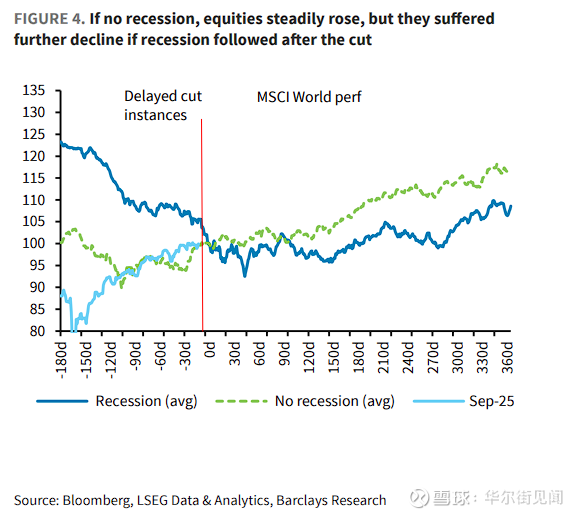 在无衰退情形下,MSCI世界指数在降息后1个月、3个月、6个月和12个月的平均表现分别为1%、2%、8%和17%。相比之下,衰退情形下的表现为-2%、2%、0%和6%,明显逊色。