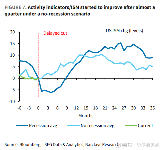 经济活动指标同样呈现类似模式。ISM制造业指数在无衰退情形下,通常在降息后约一个季度开始改善。但在衰退情形下,该指数持续下滑数个季度才见底回升。