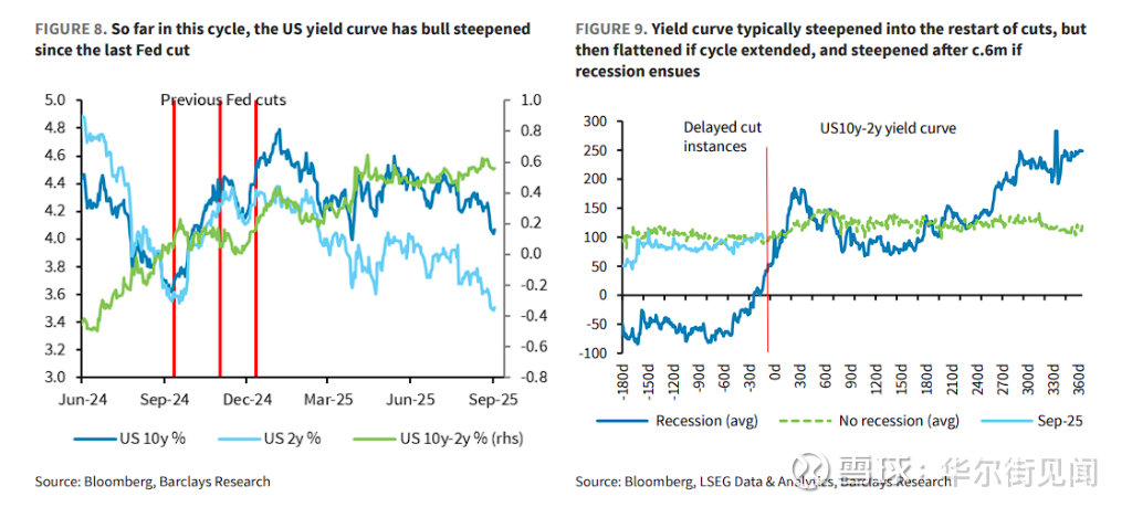 降息重启后,收益率曲线走势呈现分化。在无衰退情形下,曲线在降息后数月内温和走陡,随后转为平坦化。在衰退情形下,初始陡峭化后出现熊市平坦化,约6个月后随着经济复苏转为熊市陡峭化。