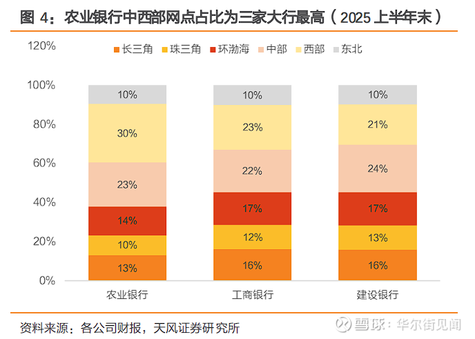 首先是"坚守卓越的管理层团队"。现任董事长谷澍具备大型金融机构的全局管理能力,曾任工商银行最年轻的国有大行行长。现任行长王志恒拥有丰富的业务和管理经验,从基层做起历练全面。 其次是"创新完善的组织架构"。农业银行通过三农金融事业部这一垂直管理模式,实现了"六个单独"的管理机制,包括单独的信贷管理、资本管理、会计核算等机制,确保资源向县域业务倾斜。 最后是"精准有效的业务策略"。农业银行采取了错位竞争的网点布局策略,在中西部地区重点布局,网点占比达53%,远高于其他大行。同时通过银政合作的风控模式和金融科技赋能,有效降低了县域金融的运营成本和风险。经营成果:三个维度全面领先
