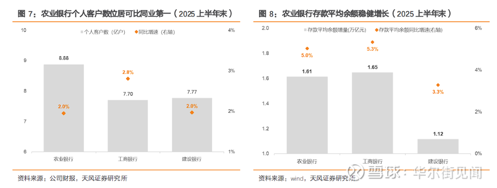 一是"客群基础稳固"。截至2025年上半年末,农业银行服务个人客户数达8.88亿户,境内人民币日均存款余额30.57万亿元,均位居可比同业首位。