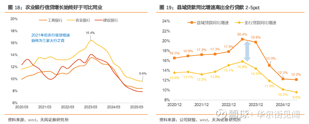 信贷增长空间广阔:天风证券分析师认为,受益于县域经济潜力释放和深度布局,农业银行未来信贷增长空间相较同业更大。数据显示,2021年以来农业银行信贷扩张速度持续显著快于可比同业,2025上半年末贷款同比增速达9.6%。