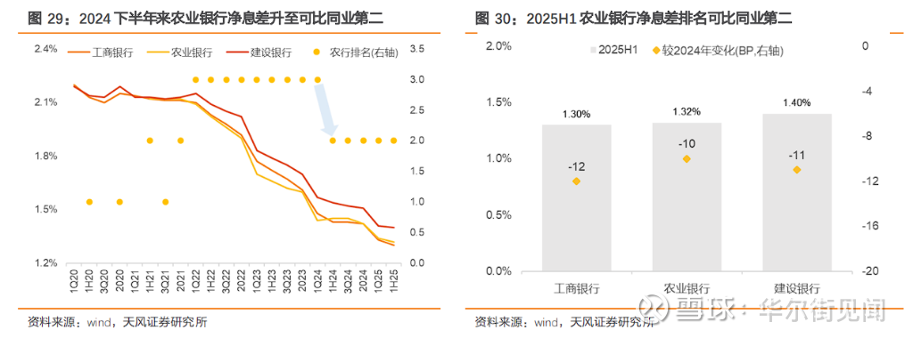 息差韧性相对较强:农业银行在负债成本控制方面具有明显优势。2025上半年,其个人活期存款占比为23%,远高于工商银行的18.6%和建设银行的20.7%。