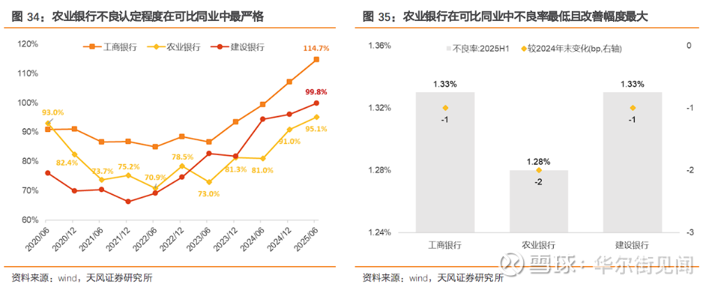 资产质量表现优异:在资产质量方面,农业银行实现了严格认定下的低不良率。2025上半年末,其不良率为1.28%,较工商银行、建设银行均低5个基点,同时逾期不良比为95.11%,为可比同业中最低。