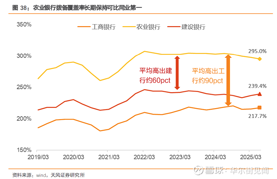 拨备安全垫充足:农业银行拨备覆盖率长期维持高位,2025上半年末达295%,远超可比同业。自2022年以来,拨备覆盖率长期维持在300%左右,平均高出工商银行、建设银行约90个百分点和60个百分点。