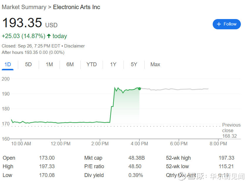 受交易报道推动,EA股价周五收盘大涨近15%至193.35美元的历史新高,推动公司市值升至约480亿美元。