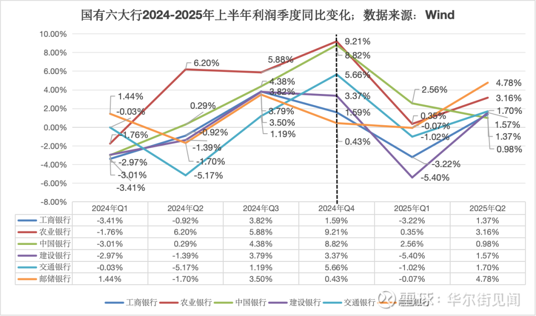 纵向回顾2024年至今国有行各季度同比表现,可以更直观地感受到邮储银行“逆势”向上的韧性——去年四季度至今,其净利增速已跃升为六大行之首。