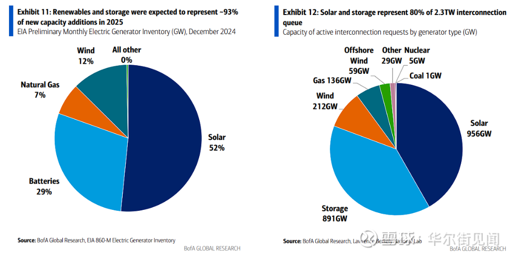 面对电力短缺和数据中心建设的阻力,市场正在寻求解决方案。研报明确指出,在短期内,太阳能和储能将是满足新增电力需求的关键。这两种技术在2024年曾占美国新增发电容量的80%,并且受到许多有可再生能源目标的数据中心所有者的青睐。然而,要确保电网稳定,天然气等可调度能源仍是近期内不可或缺的补充,而核能则被视为2030年代后的长期选项。