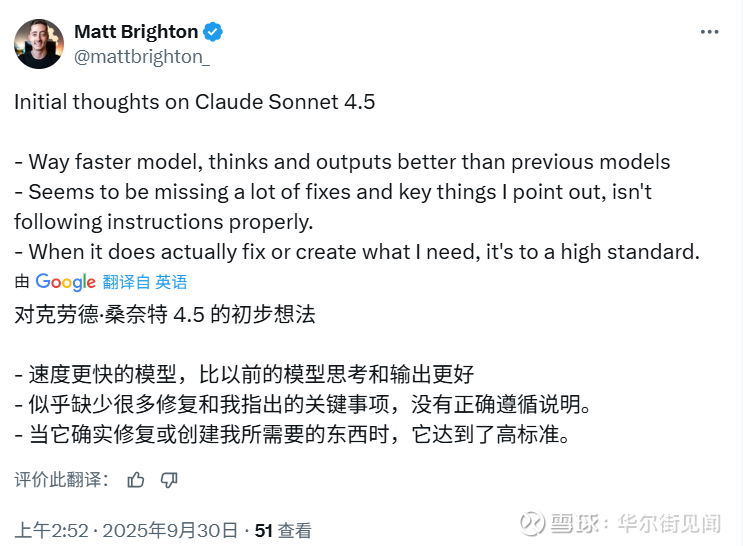对Claude Sonnet 4.5的初步想法:速度更快的模型,比以前的模型思考和输出更好;似乎缺少很多修复和我指出的关键事项,没有正确遵循说明;当它确实修复或创建我所需要的东西时,它达到了高标准。除了性能提升,Anthropic强调Claude Sonnet 4.5是其迄今为止“最一致的模型”。