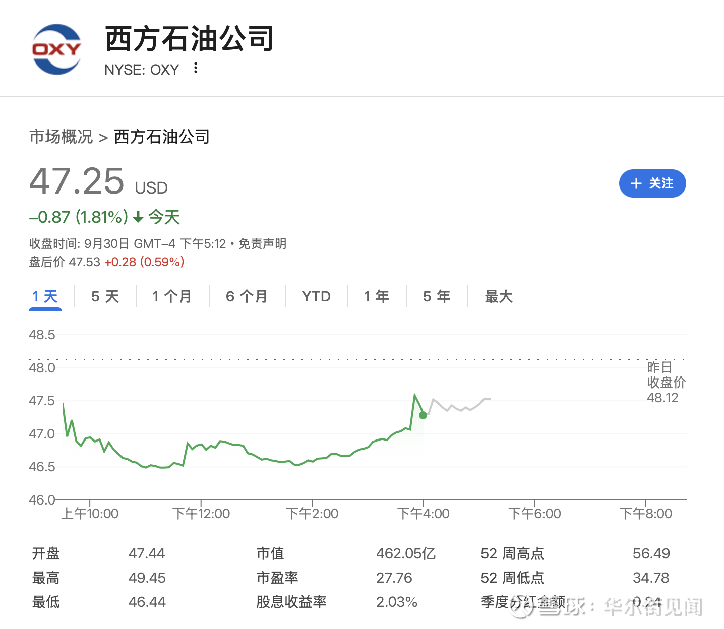 西方石油公司的股价周二收跌1.81%,报47.25美元,盘后上涨0.59%。