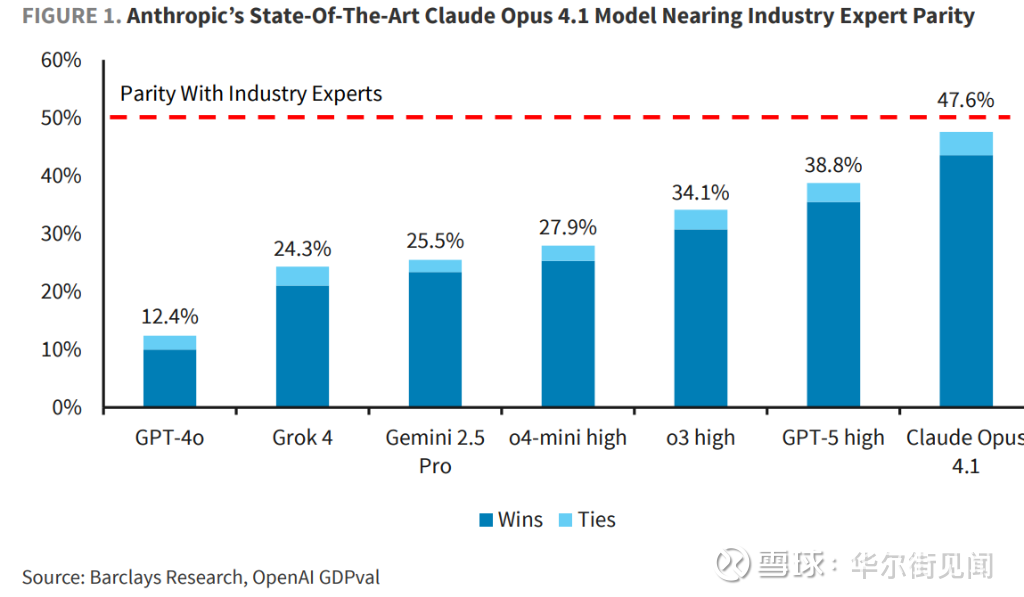 结果显示,当前最顶尖的AI模型在执行许多职业任务时,其能力已与人类专业人士相当,并且这种能力的提升速度正在加快。10月5日,据硬AI消息,巴克莱在最新研究报告中称,Anthropic的Claude Opus 4.1在与人类专家对比中取得47.6%的"胜利或平局"率,位居榜首。