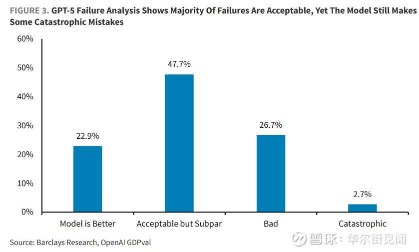 对GPT-5的失误分析显示,尽管该模型仍会犯一些灾难性错误(2.7%),但47.7%的失误被归类为"可接受但不佳",22.9%的情况下模型表现甚至优于人类。
